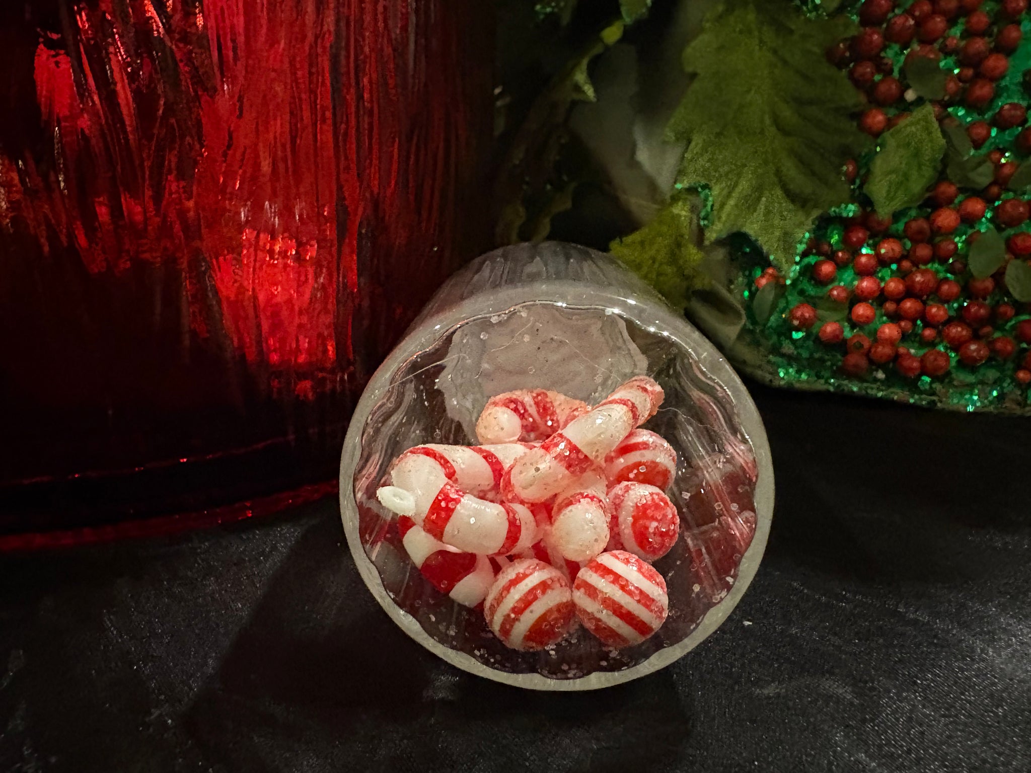 Sweeten your holiday decor with this charming peppermint candy jar ornament.  Crafted to look like a vintage glass jar filled with festive red and white candies, it adds a nostalgic, confectionery touch to your Christmas tree.  Finished with a silver lid and red-and-white twine hanger, this delightful piece captures the joy and whimsy of a classic holiday candy shop.