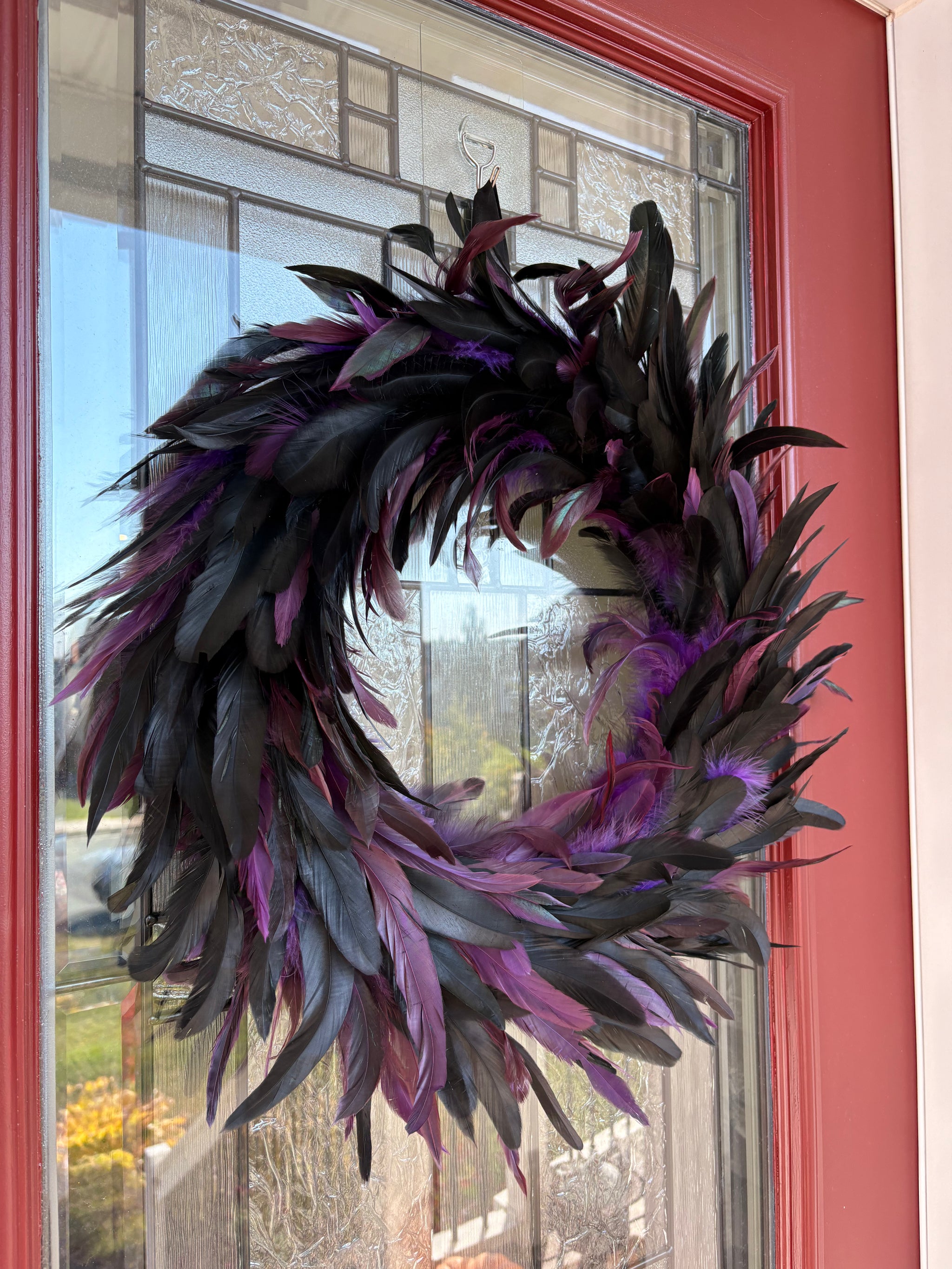 This striking wreath is made of black feathers accented with purple and irridescent green feathers for a larger-than-life look on your door.