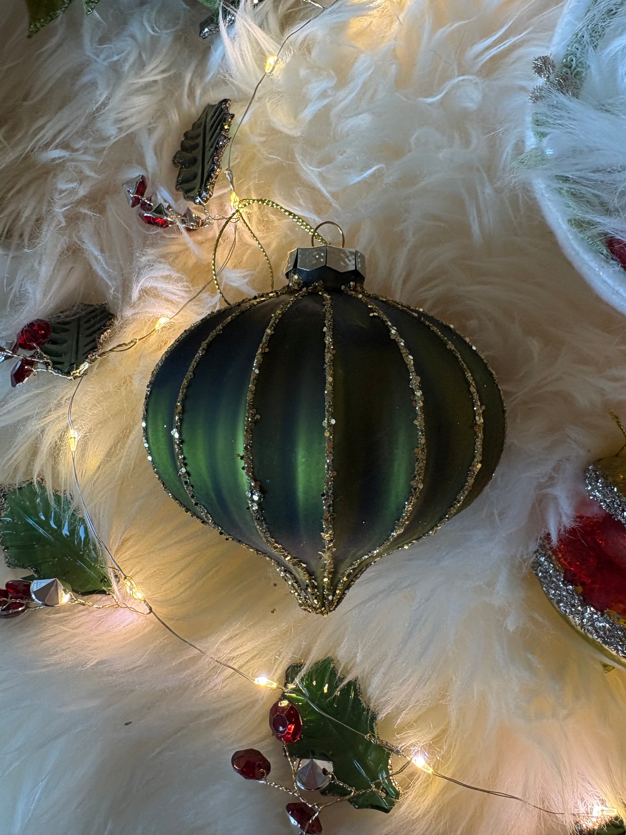 Add a touch of timeless sparkle to your holiday decor witth this ribbed glitter ornament.  Featuring a beautifully textured ribbed design and a shimmering glitter finish, it reflects light from every angle - bringing depth, elegance, and festive charm to your tree.  Whether styled among vintage pieces or modern accents, this ornament effortlessly elevates your seasonal display.