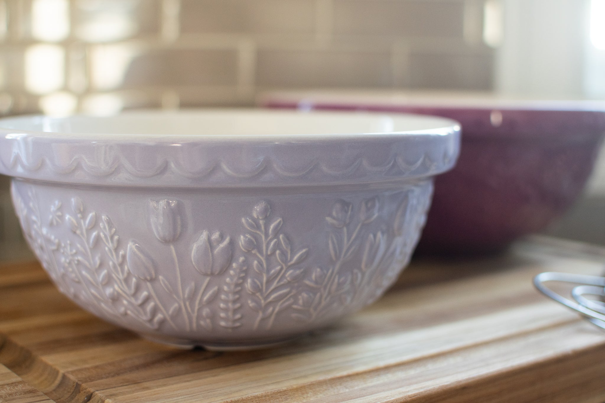 The distinct patterned exterior and rim is designed to help bakers grip and tip the bowl, while the wide shallow shape allows for kneading within the bowl.