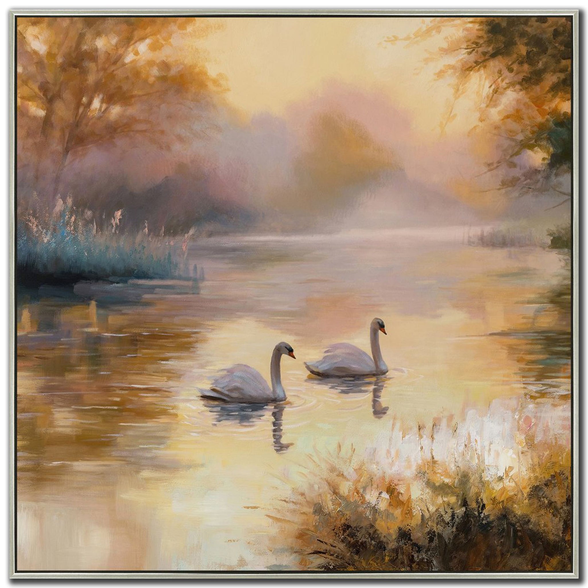 Add a touch of warmth to any room with this soft and dreamy print of two swans floating serenely against a glowy sunset.
