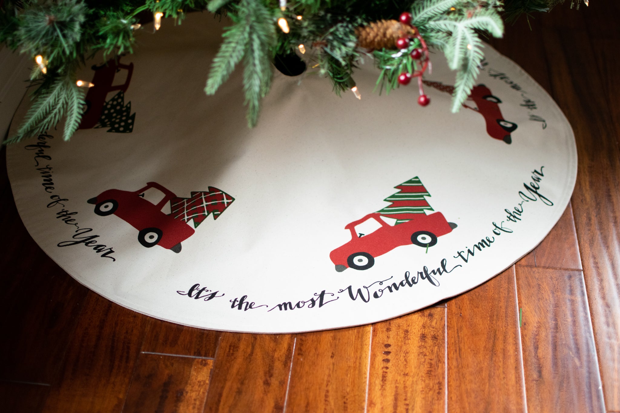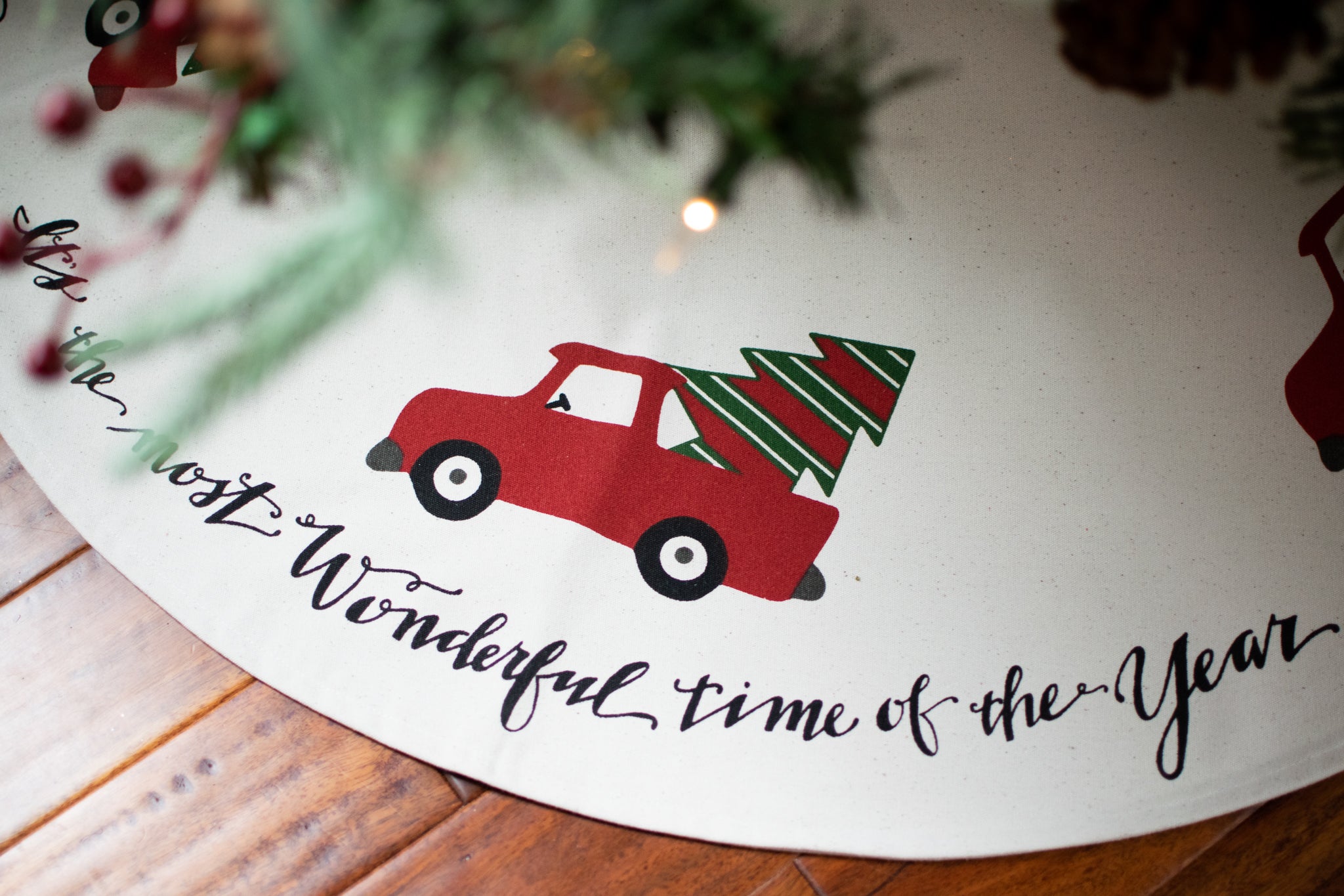 Making your Hometown Holiday decor that much more perfect, this rustic inspired tree skirt features nostalgic red trucks carting home trees along with beautifully scripted "It's the Most Wonderful Time of the Year" lettering.