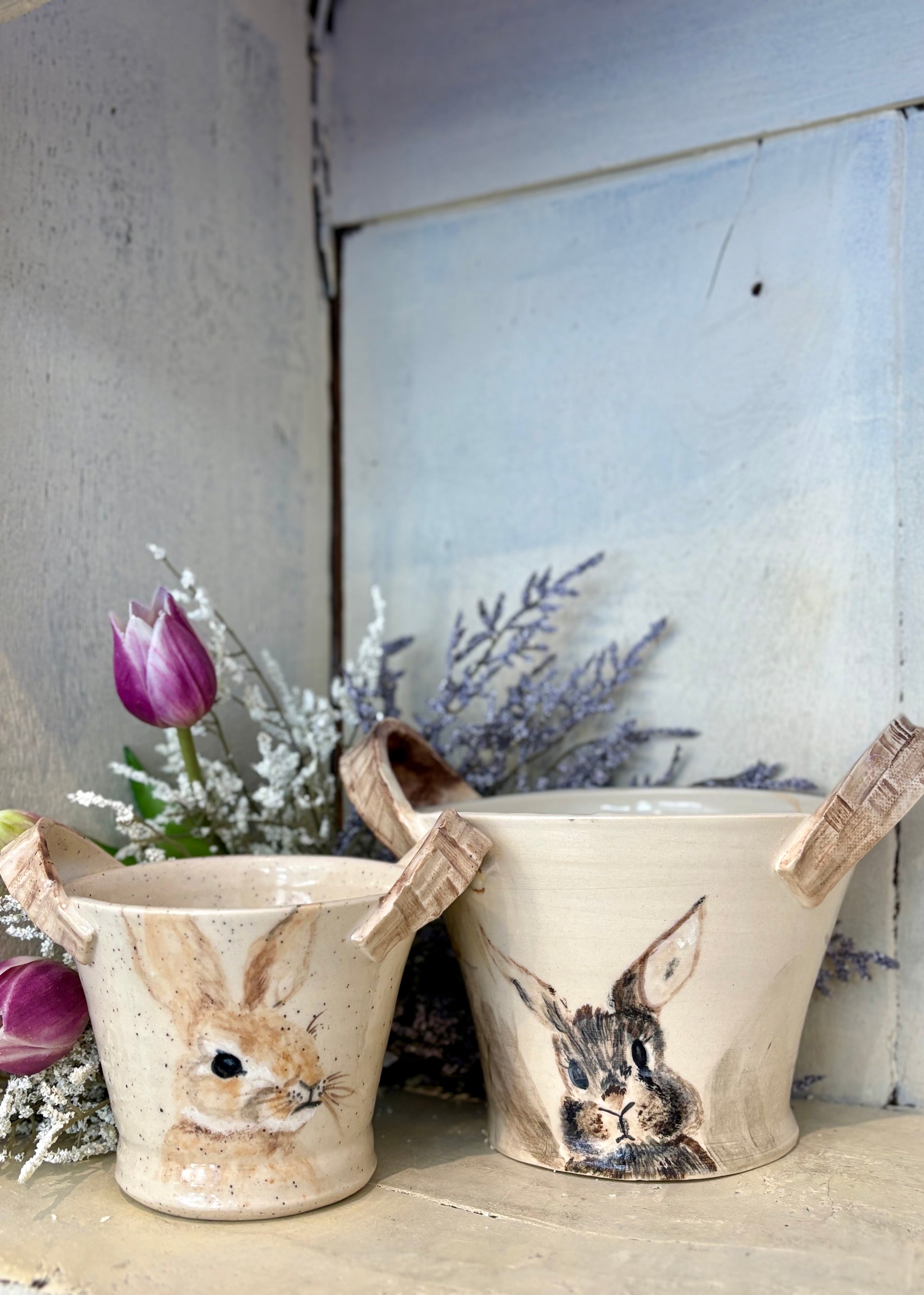 These beautifully crafted bunny baskets harken back to classic Easter baskets but, this time, with the added elegance of being made out of hand-crafted pottery and painted with cheery spring rabbits!