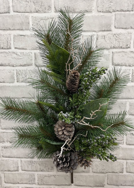 This extra full spray is filled with seasonal favourites that bring to life a winters walk in a frosted forest. Fresh Touch Norfolk Pine & Juniper, mixed with a full faux evergreen, and white washed pinecones & magnolia make for the perfect winter forest mix. We especially love using these particular sprays as an all-in-one floral for sled decorating, tablescapes and to layer into mantel designs.