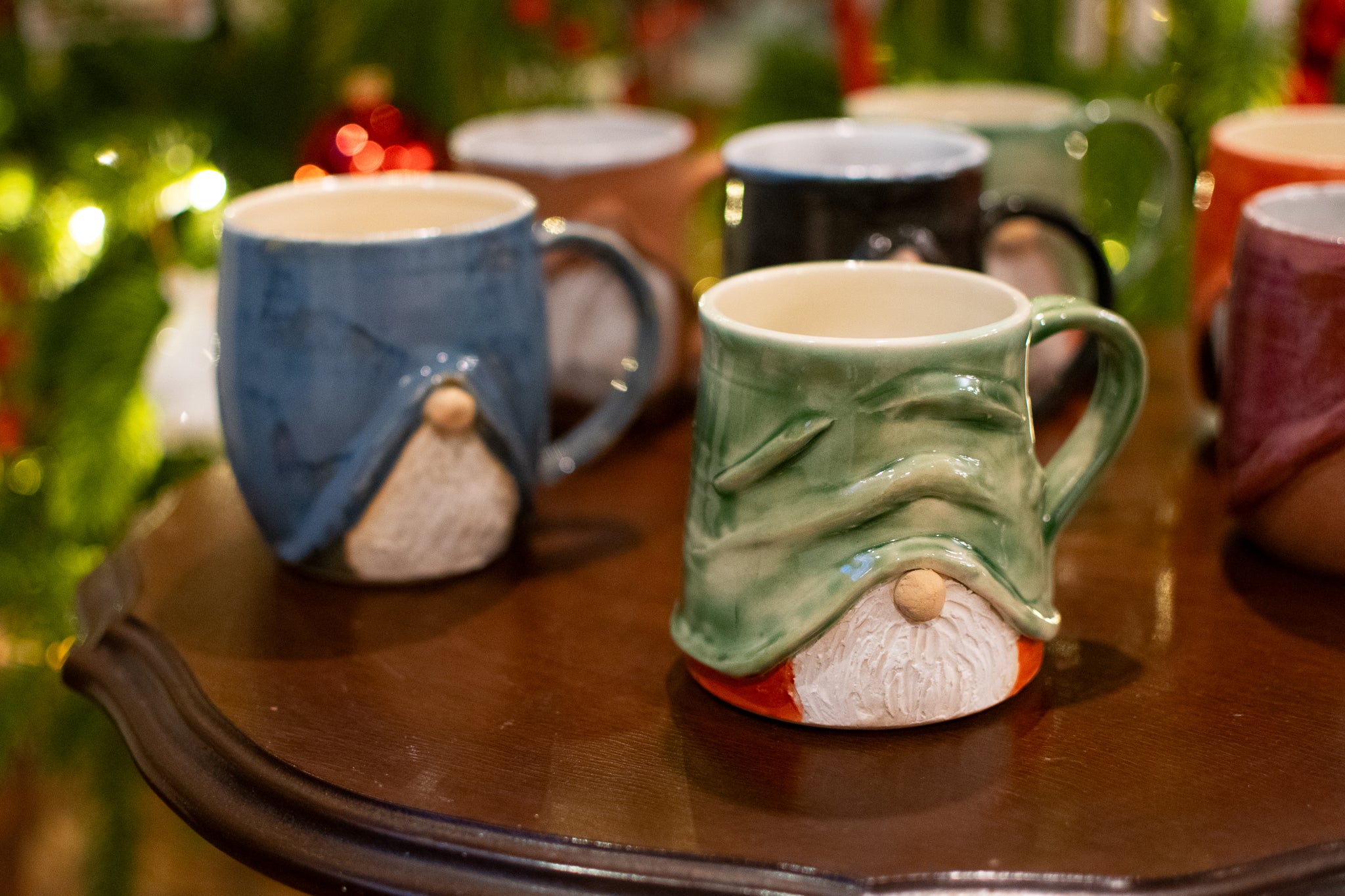 • Handmade ceramic mugs with 3D sculpted gnome features